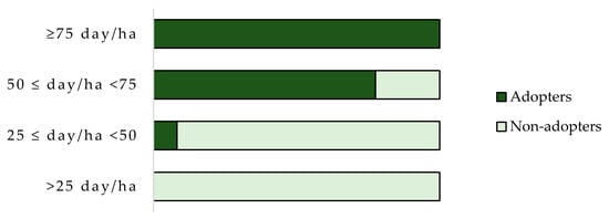 The positive relation between the level of education and PFT adoption is also demonstrated in Figure 2. Adopters are characterized by a high level of education; specifically, 62% of them had a master’s degree. In the scientific literature, it has been found that a high level of education (which can be measured in the number of years of formal education or ordinary education levels) is positively correlated with adoption [,,,,,,]. PFT required a high level of human capital in term of capabilities and skills to manage and adapt better innovations for the specific farm levels [,,,,,]. This result is related to the previous one: young individuals are better educated and more technologically savvy in using high-technological practices for management decisions. They were found to have a greater capacity to decode new information and search for suitable tools to support production [,,,]. Older farmers that are less educated and more experienced, feel less necessity to invest or acquire information on emerging technologies [,].