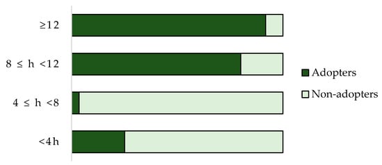 Figure 3 shows that adopters are well-informed, and they spend more than eight hours/month on information and formation activities; non-adopters dedicate less than that. “Precision Farming is an information intensive activity” []. A farmer might opt for quick adoption if he is more likely to receive new information providing PFT. It is not easy to quantify the information intensity degree of farmers. It can be measured by considering access to information from a source (mass media or interpersonal communication such as consultants or extension services), or how often an individual receives the information within a period [].