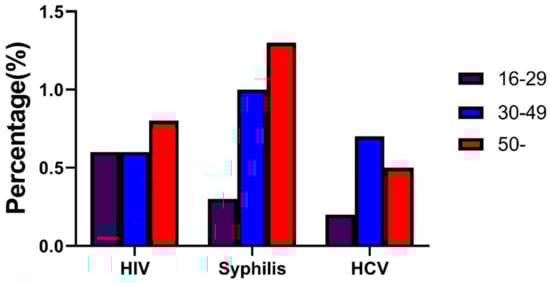 The overall prevalence of syphilis was 1.3% in the ≥50 age group, 1.0% in the 30–49 age group, and higher than 0.3% in the 16-29 group (X2 = 19.527, p < 0.001; Figure 2).