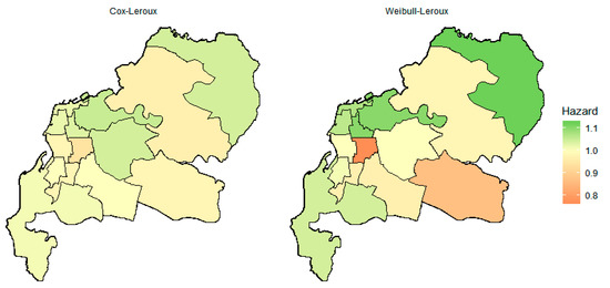 Overall, from Figure 2, we can conclude that the spatial pattern for Weibull and Cox models are broadly similar, but the Weibull–Leroux model is less smooth compared with the Cox–Leroux model. This is despite both Weibull and Cox having similar estimates for the smoothing parameter , suggesting similar amounts of spatially structured and unstructured smoothing between them.