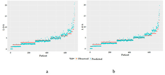 Plots of fitted values versus observed values of the (a) Weibull and (b) Cox models using a Leroux CAR prior.