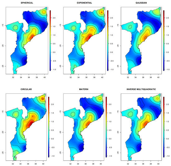 Image plots of the radial spline basis using the two stage-iterative estimation process with different covariance functions. The plotted radial spline basis is on natural log-odds scale. This illustrates the spatial variation of HIV risk in Mozambique.