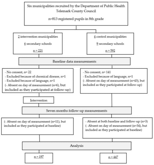 To evaluate the implementation of PA in schools by the Telemark County Council, we conducted a quasi-experimental seven-month study using a pre–post control group design. In Norway, the secondary school consists of three years referred to as 8th, 9th and 10th grade, and pupils are between 13 and 15 years of age. Inclusion criteria for this evaluation were enrolment as a pupil in the 8th grade in the 2017/2018 school year, and being in a public secondary school in the six municipalities that were enrolled for implementation of the Active and Healthy Kids program by Telemark County Council. One rural and one urban municipality implemented the program in 2017/2018 and therefore served as the intervention group, whereas three rural municipalities and one urban municipality planned to implement the program in 2018/2019 and hence served as the control group. The 1:2 ratio for intervention and control municipalities is therefore a pragmatic approach due to the naturalistic setting of the implementation. The six municipalities had a total of fifteen secondary schools and 813 pupils registered in 8th grade, all of whom were invited to participate (Figure 1).