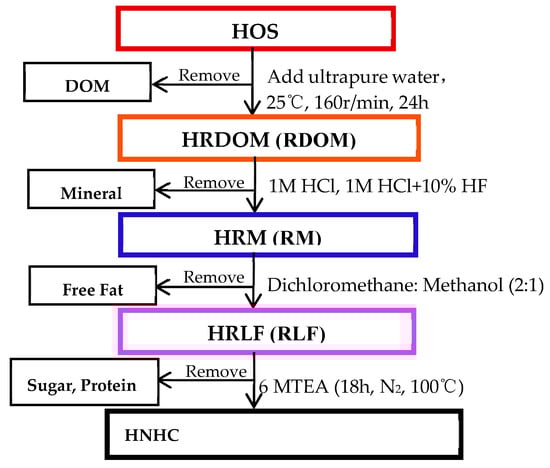 The second step was to obtain HRM fraction: Firstly, the HRDOM fraction was dissolved in 1 M HCl, shaken for one day, and centrifuged for 30 minutes to remove carbonate. To remove the silicate, the solid after centrifuge was shaken with a 10% mixture of 1m HCl and HF for 4 days. Finally, the solid was HRM fraction after centrifuging again and drying.
