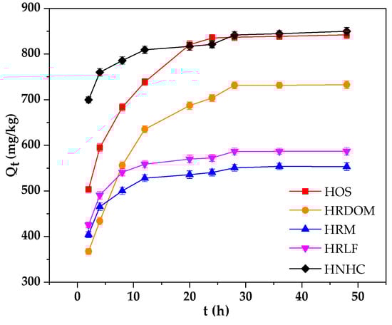 As shown in Figure 2, the adsorption rate of HRM, HRLF, and HNHC were significantly higher than that of HOS and HRDOM. This may be due to the presence of DOM and inorganic minerals so that further adsorption requires greater activation energy, and the adsorption rate becomes slow. However, HRM, HRLF, and HNHC are removed of minerals, lipids, carbohydrates, and other pollutants which can quickly reach the adsorption equilibrium. The specific amounts of five fractions were calculated as the equation listed below: