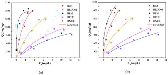 The non-linear fitting of Langmuir and Freundlich model to isothermal adsorption data is shown in Figure 3 and Table 4. All samples are fitted well with the Freundlich model by considering lower Akaike’s information criterion (AICc) []. The degree of nonlinearity and difficulty of adsorption both have negative correlations with the value of 1/n. The values of 1/n range from 0.37 to 0.63, which indicate an obvious non-linearity process for the OTC adsorption by different fractions in humus soil. HNHC is speculated to be the most likely component for OTC adsorption, followed by HOS, HRDOM, HRLF, and HRM. In addition, generally, the adsorption capacity has a positive value of KF []. Therefore, the adsorption capacity of each fraction is ordered: HNHC > HOS > HRDOM > HRLF > HRM.