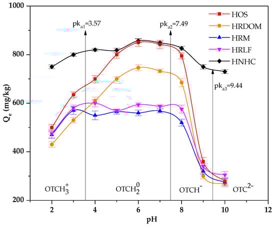 From Figure 4, we found the pH conditions can affect the adsorption of fractions other than HNHC. In general, OTC is amphoteric so that OTC exhibits different electrical properties at different PH values [,]. Furthermore, when the pH > pHzpc, the surface of the soil is negatively charged. On the contrary, the surface of soil surfaces is positively charged [,]. The pHzpc of different fractions was 5.12~5.65. When the pH is under 3.00, the dimethyl ammonium group was protonated and exists as an OTCH3+. The different fractions are positively charged. The decreases of adsorption capacity since the rejection of the charge reduces the contact of the OTC with different fractions. Similarly, when the pH is above 7.00, OTC exists as OTCH− or OTC2− owing to the loss of protons and different fractions being negatively charged. Therefore, the adsorption capacity decreases. Between pH 3.3 and 7.7, because of phenolic diketone moiety loss of proton, it exists as OTCH20. DOM can affect the adsorption of OTC through hydrophobic partitioning, complexation, and hydrogen bonding. Hence, the effects of PH on HOS and HRDOM are consistent []. It has been known that the zero charge point of most aluminosilicate minerals is around pH 3.00 []. Therefore, when the pH is lower than 3, there is no longer electrostatic repulsion between HRM and OTC. Fatty acid, polysaccharides, and protein have lots of oxygenous functional groups, which can compete for adsorption sites [,]. Therefore, the adsorption amount of HRLF for OTC is higher than HRM.