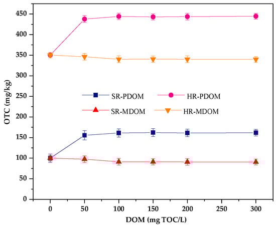 Endogenous DOM in different types of soil has opposite effects on the adsorption of OTC. Adding two types of exogenous DOM into removal of endogenous DOM of humus (HR) and sedimentary soil (SR). The results are shown in Figure 5. It was reported that PDOM (from decay plant) mainly contains humic-like substances and MDOM (from chicken manure) mainly contains protein-like substances []. It can be seen that the presence of PDOM enhances the adsorption of soil to OTC in all concentrations. However, the adsorption capacity of OTC by two soils is decreased with the increasing MDOM concentration.