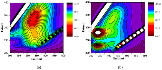 The 3D fluorescence spectra of DOM: (a) humus soil; (b) sedimentary soil.