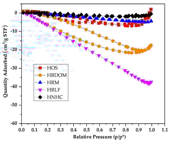 The organic matter of each fraction of the humus soil has a very smaller specific surface area than porous materials which have strong adsorption capacity. Among them, HRDOM, HRM, and HRLF are all undetected micropore volumes, while HOS and HNHC only have very small micropore volume. From Figure 8, the adsorption capacity of N2 by each fraction showed a downward trend as a whole. This is because the interaction between adsorbate molecules is stronger than between the adsorbate and adsorbent. It is further proven that a specific surface area of different fractions of organic matter are too small to purely physically adsorb. Except for HOS and HNHC showing a small amount of adsorption capacity under high relative pressure (P/P0), the remaining fractions have hardly the ability to physically adsorb OTC. It follows that the adsorption capacity is independent on the external structure. The adsorption capacity of different fractions of organic matter to OTC depends more on surface specific functional groups than surface area.