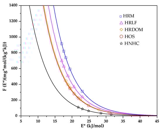 From Figure 9 it can be seen that the site energy distribution function decays rapidly by an exponential function. The adsorption sites of OTC in the HNHC fraction are distributed in the high energy region evenly, while the HRM and HRLF fractions are distributed in the low energy region evenly. In HOS and HRDOM fractions, the adsorption sites of OTC are distributed with a poor uniformity. The high energy adsorption sites of different fractions are covered by OTC in the low concentration range, thereby increasing the uniformity of surface organic matter. When adsorbed in a high concentration range, the organic matter of each fraction has a strong adsorption capacity for OTC, and there exist few high-energy adsorption sites. The adsorption process mainly occurs in the low energy region. Within a certain range, the area under the site energy distribution curve can be interpreted as the maximum number of sites available for adsorption. Therefore, OTC has more adsorption sites in the HNHC fraction, followed by HOS, HRDOM, HRLF, HRM. This indicates that the adsorption capacity of each fraction is ordered as: HNHC > HOS > HRDOM > HRLF > HRM. This result is in good accordance with the obtained data from the isothermal adsorption model.
