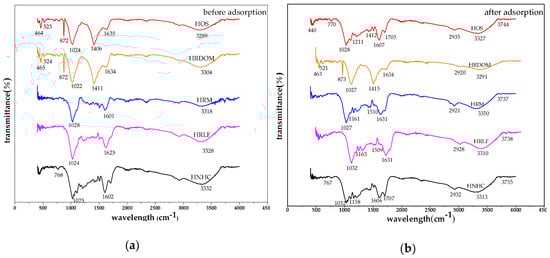 Before and after the adsorption of OTC, the changes of infrared spectra are shown in Figure 10. (1) The Si-O-Si stretching vibration peak of 872 cm−1 disappears or decreases in HOS and HRDOM samples, and the bending vibration peaks of Si-O in the vicinity of 790 cm−1, 520 cm−1, and 460 cm−1 show displacement in different degrees, which indicates that the complexation or coordination may have occurred, and the interaction intensity of HOS and HRDOM are different; (2) For all fractions, the C-O stretching vibration absorption peak is near 1020 cm−1 and the C=C telescopic vibration peak located at 1600–1635 cm−1, while the shifts and vibration intensity also changed in different degrees. In other words, the charge transfer, coordination, or complexation with different effects are produced; (3) The O-H bending vibration peaks of HOS and HRDOM around 1400 cm−1 almost disappear in HOS and weakened in HRDOM, indicating that hydrogen bonding is occurred; (4) Owing to the association between the -OH molecules, which are named hydrogen bonds, the -OH near 3300 cm−1 stretching vibration absorption peak shifts downward and the peak shape of varied degrees of changes. The peak shape of HRM, HRLF, and HNHC become sharp significantly, showing that the intensity of hydrogen bonding between the fractions and OTC is different. Further, after OTC adsorption at each fraction, the peak intensity of the 400–1600 cm−1 region also changes, which further indicates the interaction with OTC molecules varied.