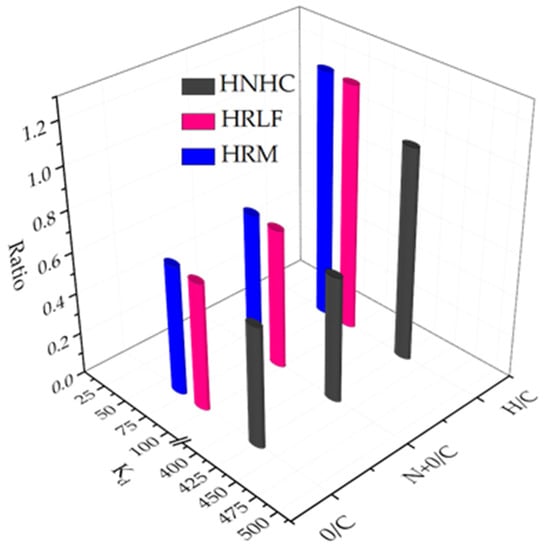 Relationship between adsorption coefficient Kd of HRM, HRLF and HNHC and H/C, (N+O)/C, O/C.