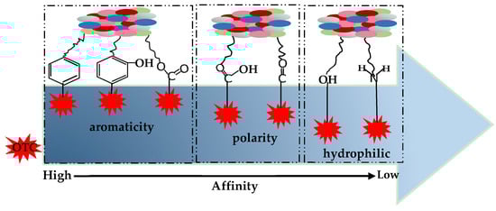 A schematic diagram for the binding affinity of aromatic, polar, and hydrophilic functional groups to OTC is established according to infrared spectra and elemental analysis (Figure 12). Using the sequential order rules, the sequence of functional groups in the interaction process of organic matter with OTC is in the order of the aromatic functional groups, i.e., C=C, phenolic and aliphatic > the polarity groups, i.e., carboxyl and carbonyl > the hydrophilic functional groups, i.e., hydroxyl and amino.