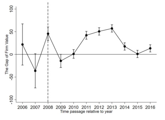 Based on Equation (3), we obtained the results of the differences of the characteristic variables before and after using the kernel matching in Table 6. Before kernel matching, there were significant differences between EID firms and non-EID firms. For example, the mean difference of cash flow between EID and non-EID firms before employing the PSM method was significant at the 1% level before the implementation of EIDMT. Namely, there was a sample selection bias. However, after the matching, the p-value of the cash flow after applying the PSM method was more than 10%, which indicates that there was no significant difference between the EID firms and non-EID firms, consisting with the result of the sample selected from 2002 to 2016 in Table A5.
