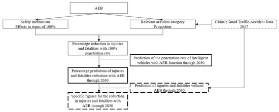 In this study, the numbers of injuries and fatalities without AEB through 2030 are multiplied by the percentage reduction in injuries and fatalities with AEB through 2030 to obtain the reduced numbers of injuries and fatalities with AEB through 2030, as shown in
