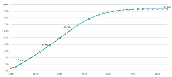 24]. The GDP growth rates are predicted to be 6% in 2020, 3% in 2030, 2.4% in 2040, and 2% in 2050 [