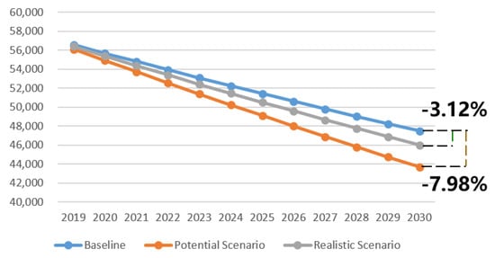 Based on the above discussion, three different scenarios are defined in this research to discuss AEB’s potential and realistic safety impact for reducing fatalities and injuries in China through 2030. Scenario 1 is a baseline scenario, representing injuries and fatalities without AEB through 2030. Scenario 2 is an optimistic scenario, indicating the potential maximum reduction in injuries and fatalities. In the optimistic scenario, it is assumed that an advancement in sensor technology enables AEB to work in bad weather and low light, that all drivers turn on the AEB system, and that AEB technology can effectively work over the entire speed range. Scenario 3 is a pessimistic scenario, representing realistic reductions in fatalities and injuries at the current technology level. The pessimistic scenario considers the AEB activation ratio and its technical limitations, including weather, light, and speed conditions.