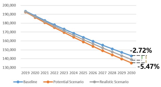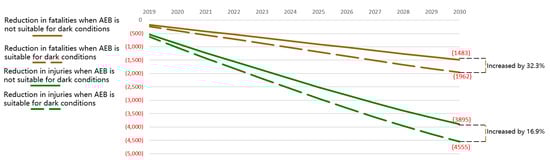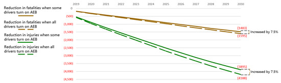 Figure 6. This outcome means that the reduction in fatalities will increase from 1483 to 1962 in 2030, and the reduction in injuries will increase from 3895 to 4555.