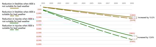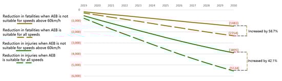 Figure 5. This outcome means that the reduction in fatalities would increase from 1483 to 2354 in 2030, and the reduction in injuries will increase from 3895 to 5534. Although full-range speed applicability can greatly improve safety, it is a comprehensive and technically difficult problem.