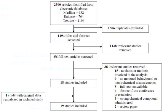 Nineteen included studies were reviewed and information from each article was abstracted, including: year of study, toxicant of interest, objective, study design, maternal subjects, sample size, treatment groups, exposure route, exposure period, behavioural findings, and neurochemical findings.