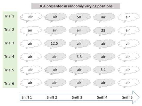The presentation of odor-bags was done in a single-blinded manner, with participants using blindfolds during trials in a concentration interval from 50 to 0 ng/m3 of 3CA. The test was organized in six successive trials with descending concentrations in the first five trials (50, 25, 12.5, 6.1, 3.1) and zero concentration in the sixth trial (0, sham). Each trial comprised five sniffs, the first always from a bag with clean air, followed by a triplet of bags in random order where two contained clean air and one contained 3CA, and finally a fifth bag with clean air (Figure 1).