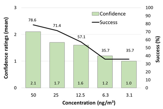 Of the 44 consecutive study participants, the last 14 were tested in the concentration range from 50 to 0 ng/m3 (Figure 2). Three of four males failed at 50 ng/m3, even though they had previously recognized odor at this concentration. Still, more than two thirds of the 14 participants successfully detected 3CA at 50 and 25 ng/m3 (79% and 71%, respectively), more than half detected 3CA at 12.5 ng/m3 (57%) and more than one third (36%) even detected 3CA at the two lowest concentrations (6.3 and 3.1 ng/m3). Taking a closer look at confidence ratings given by participants after successful selection of odor bag (results not shown), we see that the highest confidence rating (“sure”) was only used by half of the participants (50%) and only after sniffing 3CA at the three higher concentrations (50, 25, 12.5 ng/m3). When participants in the last trial had only bags with clean air to choose from, but were told that one contained 3CA, all but one participant (93%) gave low confidence ratings (36% “followed a feeling”, 57% “random”).
