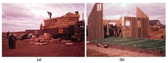 (a) Delivery in the early 1960s of a house from ÅsedaHus, one of many companies that produced prefabricated homes in the 1960s and 1970s [32], as well as, e.g., kindergartens, schools and offices. (b) The house is erected on a ventilated crawlspace with preserved wood (green) that will eventually be invisible below the interior flooring. ÅsedaHus used KP-Cuprinol for impregnation and chlorophenols (CPs) for dipping, as reported by the company [33] and supported by historical investigation before sampling of soil [34] and analyses of polluted soils showing CPs and dioxins at the manufacturing site [35].