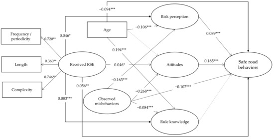 - Just as the received RSE, observed misbehaviors in parents and peers also have a significant (but negative) effect on road safety skills: risk perception (β = −0.163 ***), attitudes towards road safety (β = −0.268 ***) and rule knowledge (β = −0.084***), as well as a negative and significant effect on the performance of safe road behaviors (β = −0.107 ***).