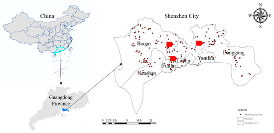 In order to ensure a better investigation result, this paper selected the specific research community based on the waterlogging spot data of Shenzhen. Simultaneously, considering that there was no flooding in high-rise residential buildings, we finally chose five low-rise communities near the easily flooded areas in three different districts (Figure 1).