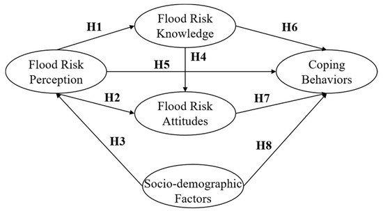 • Socio-demographic factors → flood risk perception → flood risk knowledge → flood risk attitudes → protective coping behaviors.