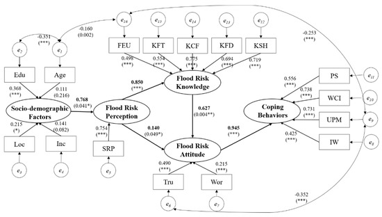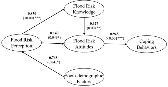 As hypothesized, there is a complex correlation between flood risk perception, socio-demographic factors, flood risk knowledge, flood risk attitude, and protective coping behaviors (Figure 3). The correlation between flood risk perception, flood risk knowledge and protective coping behaviors is highest. Socio-demographic factors have the lowest correlation with protective coping behaviors. Although correlation analysis is able to find the connection between factors, it cannot discover the influence path. In other words, the correlation between the two factors is possibly due to the existence of indirect effects, rather than the direct influence of the variables. For example, Grahn and Jaldell [37] have proved the link between flood risk perception and flood risk knowledge, and we discover that flood risk knowledge is closely related to protective coping behaviors. So, it believes that the relationship between flood risk perception and protective coping behaviors is not that straightforward. How exactly flood risk perception, socio-demographic factors, flood risk knowledge, flood risk attitudes and protective coping behaviors interact is to be further proved by path analysis in the next section.