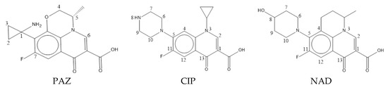 Molecular structure of pazufloxacin (PAZ), ciprofloxacin (CIP), and nadifloxacin (NAD).
