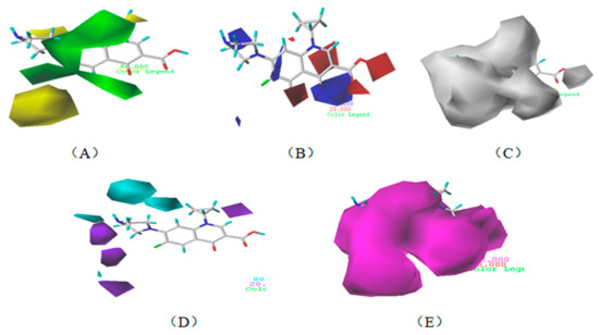 Figure 2 shows the contour maps of the constructed CoMSIA model. The CIP molecule was taken as an example. The hydrophobic and hydrogen bond acceptor fields had a higher contribution rate; the white (Figure 2C) and purple area (Figure 2E) covered almost the entire molecule, indicating that they had effects on each site and were not representative. As the contour maps of the electrostatic fields (Figure 2B) show, the blue area was distributed at the C=O position of the carbonyl group and at the N atom position of piperazine ring. The red area was mainly distributed at site 13 and the common skeleton of quinolones. Regarding the contour map of the hydrogen bond donor fields, the colors were both mainly distributed around the piperazine ring, which had no significant effects. The steric fields are shown in Figure 2A; the green area distributed at site 3 and around the benzene ring, and the yellow area was mainly around the piperazine ring. The introduction of the large volume group in the green area or small volume group in the yellow area would enhance the double-activity characterization value of green algae toxicity and bacterial genotoxicity of the CIP molecule [26]. In summary, the substitution of large volume substituent groups at site 3 would improve both the green algae toxicity and bacterial genotoxicity of the CIP molecule.