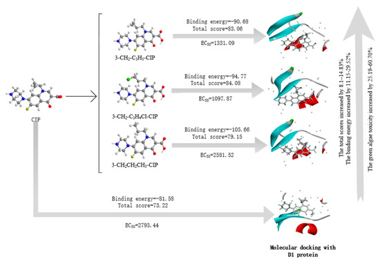 Taking green algae toxicity as an example, the binding energy of the derivatives to the protein was calculated as shown in Table 9. The binding energy of all the derivatives was increased, indicating that they were easier to bind to the protein. The binding energy change rates of the no. 1 (3-CH2-C3H5-CIP) and no. 2 (3-CH2-C3H4Cl-CIP) molecules were basically consistent with their change in total scores. The accuracy of the molecular docking scores was verified. The mechanism of CIP derivatives’ green algae toxicity is shown in Figure 3.