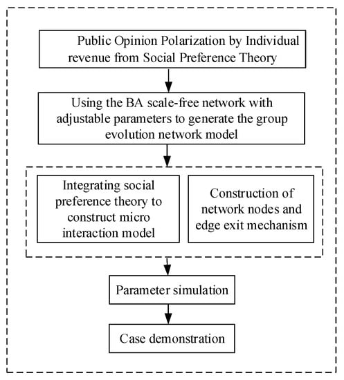 Based on the multi-agent method of Monte Carlo, we take individuals participating in interactions as agents []. Also, the network scale is set as N, meaning there are N Internet users (network nodes) in the network. Each individual’s attitude value in the network is represented by a number in the continuous interval [−1,1], and his/her initial attitude value obeys the random value of a uniform distribution. The specific research framework is shown in Figure 1: