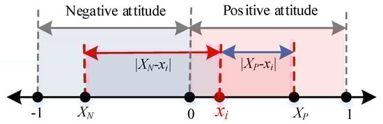 When xi ∈ [0,1], agent i has a positive attitude, which is more likely to be recognized by individuals with positive attitudes and repelled by ones with negative attitudes, as shown in Figure 3. The concrete calculation process is represented by Equation (5).