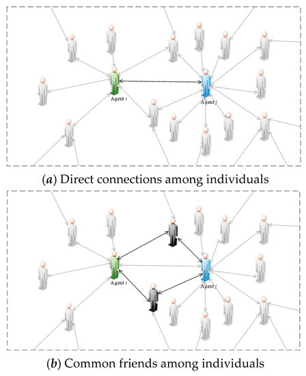 From Figure 4a, agent i and agent j are directly connected (see black lines in Figure 4a), meaning there is an interaction between them. Similarly, in Figure 4b, among all individuals connected with both agent i and agent j, there are two common connected individuals (see black humanoid nodes and black lines in Figure 4b), indicating that these two individuals have interactions with agent i and agent j at the same time; that is, these two individuals are the mutual friends of agent i and agent j. In a social network, the phenomenon that “friends of friends are your friends” often occurs, and two individuals with more common friends tend to be closer than two ones with fewer common friends. Therefore, we assume that the intimacy between two individuals is positively correlated with the number of mutual friends. However, as shown in Figure 4c, since the number of individuals connected with agent j (see blue lines in Figure 4c) is larger than that connected with agent i (green line), agent i and agent j have different intimacy degrees in spite of the same number of common friends between them. Assuming that the number of individuals connected to agent i in a network is Ni, and also, the number connected to agent j is Nij in Ni(Nij = Nji), then the intimacy degree of agent i and agent j, hij, is expressed as follows: