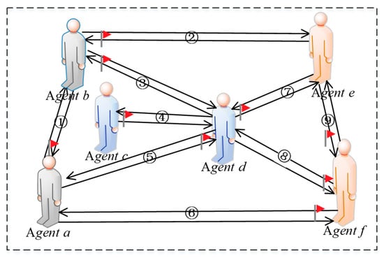 In Figure 5, humanoid nodes represent interactive individuals in a network, where the gray nodes represent individuals with fair preference, the blue represent ones with egoistic preference, and the orange represent those with altruistic preference. In addition, serial numbers are used to represent different preferences, where “①” indicates interactions among individuals with fair preference, “④”describes interactions among individuals with egoistic preference, “⑨”represents interactions among individuals with altruistic preference, “②” and “⑥” represent interactions between individuals with fair preference and ones with altruistic preference, “③” and “⑤”denote interactions between individuals with fair preference and ones with egoistic preference, “⑦” and “⑧” indicate interactions between the individuals with egoistic preference and ones with altruistic preference. The red flag next to the humanoid node in Figure 5 indicates that the individual gains more by interacting than interlocutor. For example, in the interaction between agent a and agent b, there is a red flag on the side of agent a, denoting that the revenue of agent a is greater than that of agent b. Therefore, Figure 5 indicates that the quantitative relationships derived by comparing revenue with respect to individual interactions are as follows: U(a) > U(b), U(b) > U(e),U(b) > U(d), U(c) > U(d), U(d) > U(a), U(f) > U(a), U(d) > U(e), U(f) > U(d), U(f) > U(e).