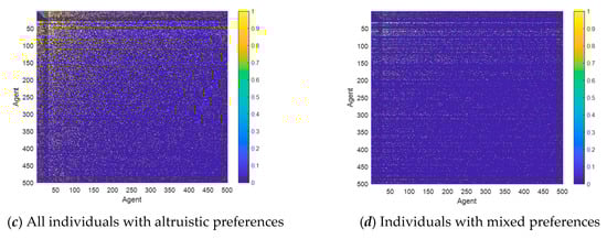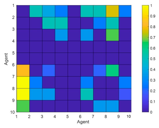 From Figure 9 and Equation (18), in the network with the number of nodes N setting as 10, there are at most (10−1)2 = 81 edges except for himself/herself, and each edge corresponds to an intimacy value. For example, in Equation (18), the intimacy value at the matrix element h(1,2) is 0.5, indicating that the intimacy degree between agent 1 and agent 2, h12, is 0.5. In Figure 9, the color in the grid of the first row and the second column represents 0.5. If the value at element (i, j) in the matrix is 0, it means that agent i and agent j are not connected. At this point, the color of the grid in Figure 9 appears dark blue. Notice that all h(i,i) in the matrix’s diagonal line are meaningless and thus are represented by 0.
