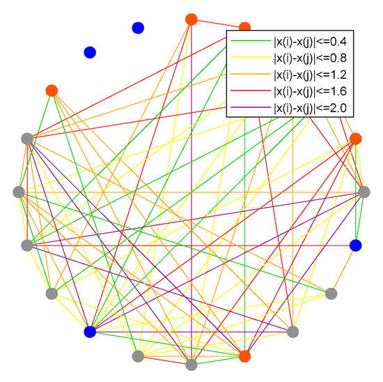From Figure 16, the attitude values of all individuals xi ~ U(−1,1) in the network at the initial moment are evenly distributed, while at time = 10, there is an obvious polarization, and the attitude values of most individuals are at the extremes of +1 and −1. Figure 17 shows the connections of network nodes at the initial time and time = 10. As shown in Figure 17 and Figure 18, three kinds of scatter points represent individuals with different preferences in the network: the grays catter points represent individuals with fair preference, the blue ones represent individuals with egoistic preference, and the orange ones represent individuals with altruistic preference. In these two figures, the lines represent the connection relationships among the scattered points. If there is a line between two scattered points, they are neighbors and can interact with each other, where the lines include five colors, i.e., green, yellow, orange, red, and purple. Since the attitude values are evenly distributed in the interval [−1,1] at the initial moment, the attitude distance between two individuals is relatively small, and |xi − xj| > 1.6 is less likely to occur. After the polarization phenomenon occurs, as shown in Figure 17b, the attitude values of all individuals in the network change significantly, and most individuals show green and purple lines, representing the two extremes of the attitude distances between adjacent individuals |xi − xj| < 0.4 or |xi − xj| > 2.0.
