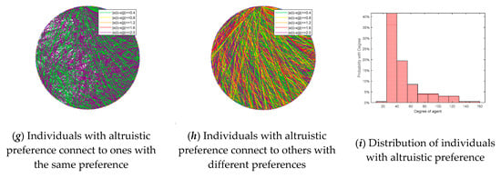 In addition, Figure 19 shows the connections and distribution of three different preferences in the network after the occurrence of public opinion polarization phenomenon, in which the lines and scatter points are represented in the same way as shown in Figure 17, that is, the scatter points of three different colors represent the individuals with different preferences, and the lines of different colors represent the different attitude distances among neighboring individuals. From the vertical comparisons in Figure 19, we can see that the connections among individuals with fair preference and altruistic preference change little in the network, while the connections among individuals with egoistic preference almost completely break. The horizontal comparisons in Figure 19 show that individuals with different preferences are more likely to interact. Figure 19a,d,g represents the interactions among individuals with the same preference, respectively. At this point, the attitude distance among individuals with the same preference almost only has two extreme values, |xi − xj| < 0.4 or |xi − xj| > 2.0. In contrast, the interactions among individuals with different preferences represented in Figure 19b,e,h appear more connections of intermediate attitude distances, which illustrates that after the emergence of public opinion polarization, the existence of more differentiated individuals is easier to stabilize the network. Moreover, Figure 19c,f,i shows the degree distribution of individuals with different preferences, in which the network degree distribution of egoistic individuals is significantly smaller than that of the other two preferences, while the difference between fair preference and altruistic preference is not obvious.