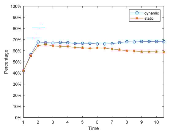 However, it is worth noting that Internet users have obvious preferences in the public opinion communication of the network hot event. Because many netizens prefer to support the weak, when the information is not clear at the beginning, almost all of them supported pregnant women one way. However, with the truth gradually revealed, there were many individuals who still maintained their preferences and did not change their views. Therefore, we simulate the event using the public opinion polarization model which considers individual heterogeneity preference and compares the macro polarization model in []. The parameters we used in the simulation are as follows: α = 0.15, β = 0.8, γ = 0.05, the network is a BA scale-free network with clustering C = 0.324. The results are shown in Figure 26.