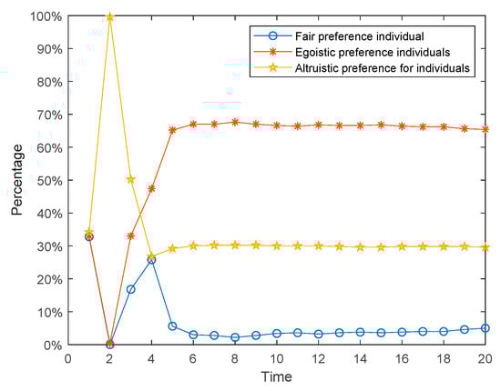 In Figure 27, at the initial moment, the individual preferences change greatly. Firstly, their preferences change to the fair preference, and then quickly change to the egoistic preference. From the perspective of isolated individuals, the number of individuals with an egoistic preference withdrawing from public opinion interactions is the largest. From the perspective of revenue, the individuals with an altruistic preference have the largest revenue in the network.