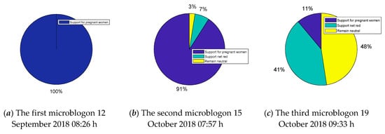 The incident of “Internet red beating pregnant women” attracted the attention of microblog bloggers “Headline News”, which has 68 million fans. “Headline news” released three microblogs about the incident on 12 September 2018 08:26 h, (the data collected can be found in the following link: https://weibo.com/breakingnews?is_all=1&is_search=1&key_word=%E7%BD%91%E7%BA%A2%E6%AE%B4%E6%89%93%E5%AD%95%E5%A6%87#1579968622052), 15 October 2018 07:57 h (the data collected can be found in the following link: https://weibo.com/breakingnews?is_all=1&is_search=1&key_word=%E7%BD%91%E7%BA%A2%E6%AE%B4%E6%89%93%E5%AD%95%E5%A6%87#1579968662315), and 19 October 2018 09:33 h (the data collected can be found in the following link: https://weibo.com/breakingnews?is_all=1&is_search=1&key_word=%E7%BD%91%E7%BA%A2%E6%AE%B4%E6%89%93%E5%AD%95%E5%A6%87#1579968683067), respectively. These microblogs are widely focused, with more than 10,000 comments per microblog.Therefore, in order to accurately restore the public opinion development process of the “Internet red beating pregnant women” incident, we separated the comments under these three microblogs of “headline news” and analyze them. Through the emotional orientation [] in the comments, we roughly divided the comments we have separated into three categories: those who support pregnant women, those who support the internet red, and those who maintain neutrality, as shown in Figure 25: