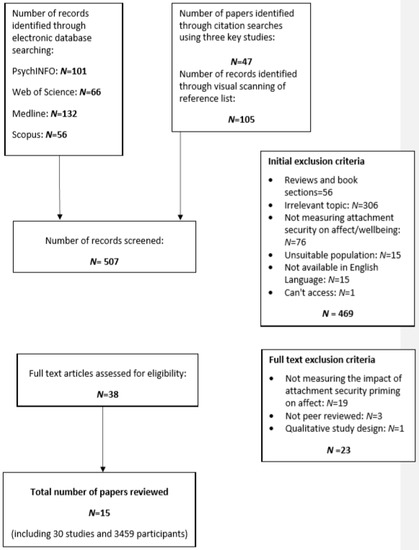 Four electronic databases were used: PsychINFO, Web of Science, MEDLINE and Scopus (see Figure 1). An initial search between July 2018 to August 2018 yielded 355 results (it should be noted that some of the results were duplicates so the number of unique papers was smaller.) (101 PsychINFO, 66 Web of Science, 132 MEDLINE, 56 Scopus). Backward and forward chaining techniques, including examining reference lists and citations in the three key studies most closely related to our systematic review question [22,23,24] yielded 196 papers, resulting in 507 results in total. Searches were conducted using the following terms (a) attachment security priming, (b) affect, and (c) children and adults. The search terms for attachment security priming included prime*, priming and attach* or secur*. They also included affect* or effect* (using the word ‘effect’ for affect was to allow for spelling mistakes that may have occurred.) or anxi* or depress* or positive mood or negative mood, child*, young person, adolescen*, teen*, young adult*, adult*.