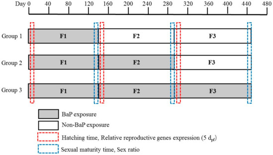 The offspring of the F1 generation was continually exposed to BaP (G2F2) and non-BaP (G1F2), respectively. Similarly, the offspring of G1F2 was also exposed to non-BaP (G1F3), and the offspring of G2F2 was exposed to BaP (G3F3) and non-BaP (G2F3), respectively (Figure 1). This design was used to observe the persistence of the tendency of reproductive system interference in marine medaka at different exposure patterns of BaP. The F2 and F3 generation embryos were maintained for 145 and 158 days according to parental group under the same culture conditions as the F1 generations. Twenty embryos were homogenized and stored at −80 °C for subsequent RNA extraction in 5 dpf at each group, respectively.