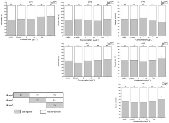 Figure 2 shows the sex ratio of marine medaka in different groups exposed to BaP. Under the BaP exposure, there was a significant increase in male marine medaka at 20 and 200 μg·L−1 in the F1 generation. However, there was also a significant increase in female marine medaka in the G1F3 generation of non-BaP exposure. Both G2F3 and G3F3 were significantly increased in males after BaP exposure.