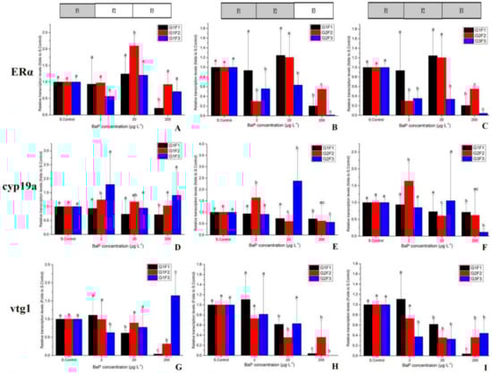 The mRNA levels of the genes in embryos after exposure to BaP for 5 dpf. Bars with different letters indicate statistical significance (p < 0.05) as assessed using one-way ANOVA followed by the LSD test. (A–C) ERα gene expression at different exposure patterns; (D–F) cyp19a gene expression at different exposure patterns; (G–I) vtg1 gene expression at different exposure patterns.
