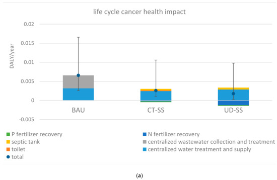 (a) Life cycle cancer health impact of BAU, CT-SS, and UD-SS, DALY/year. The range of variability bar presents the values at 5th and 95th percentiles. (b) Life cycle noncancer health impact, DALY/year. The range of variability bar presents the values at 5th and 95th percentiles. (c) Life cycle and microbial health impacts, DALY/year. The range of variability bar presents the values at 5th and 95th percentiles.